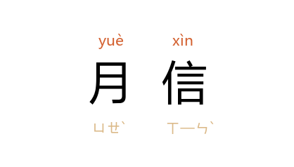 引明 汤显祖 《南柯记·偶见》:“[老]咳,俺去不得。俺真是个信女,把 水月观音 倒做了。[小旦]怎么説?[老]月信来了。”《醒世姻缘传》第十九回:“晁住 老婆……觉得下面似溺尿一般,摸一把在那月下看一看,原来是月信到了。”清 纪昀 《阅微草堂笔记·滦阳续录三》:“既由精合,必成於月信落红以后,何也?”