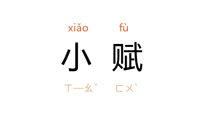 ⒈ 汉 代后期继大赋后出现的新体赋,至 六朝 而盛行。多为抒情作品,篇幅较小,少用典故。至 唐 宋,进士考试科目中的律赋亦称小赋。