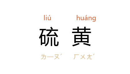 ⒈ 一种非金属元素。在常温下为黄色固体,性烈易燃,为制造火药、火柴等的原料,亦可作二硫化碳、硫酸、农药、肥料、染料等工业原料,也可作为药品。也作「流黄」、「硫磺」。
