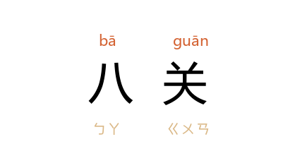⒈ 指八个关口。(1)指汉末为镇压黄巾起义特设的八关都尉所辖的八关。《后汉书·灵帝纪》:“﹝中平元年﹞,置八关都尉官。”李贤注:“八关谓函谷、广城、伊阙、大谷、轘辕、旋门、小平津、孟津也。”(2)指明末腾越州西南边境内的八关。明万历二十二年(公元1594年),云南巡抚陈用宾筑,名为神护、万仞、巨石、铜壁、铁壁、虎踞、天马、汉龙。关址距当时边界或数十里或百余里不等。清季中英勘定滇缅边界,虎踞、天马、汉龙三关划属缅甸。明徐弘祖《徐霞客游记·滇游日记九》:“八关自其西北斜抵东南。西四关属蛮哈守备,自西北而东南:一曰神护,二曰万仞,三曰巨石,四曰铜壁。东四关属陇把守备,自西北而东南:一曰铁壁,二曰虎踞,三曰天马,四曰汉陇。”