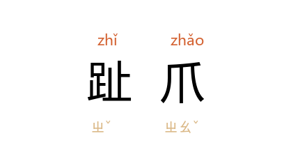 引明 李诩 《戒庵老人漫笔·十二生肖》:“十二生肖之义,尝闻人述 浙江 参政 左公赞 之言,谓以足上趾爪奇耦辨辰数之奇耦。”鲁迅 《朝花夕拾·<狗·猫·鼠>》:“忽然,桂树上沙沙地有趾爪的爬搔声,一对闪闪的眼睛在暗中随声而下。”