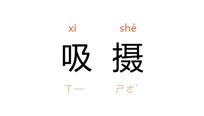 引康有为 《<大同书>甲部序》:“有觉知则有吸摄,磁石犹然,何况於人。”曹禺 《王昭君》第二幕:“她风韵万千,吸摄着一朝上下的眼神。”杨沫 《乡思的朝和暮》:“我的眼,我的心在贪婪地吸摄着家乡土地上一草一木的颜色。”