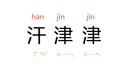 引元 无名氏 《抱妆盒》第一折:“脸儿呵汗津津显出桃花片。”《红楼梦》第十二回:“贾瑞 自觉汗津津的。”郭澄清 《大刀记》第十七章:“古铜色的光膀子,汗津津的,被太阳一照闪着光亮,好像涂上了一层油。”