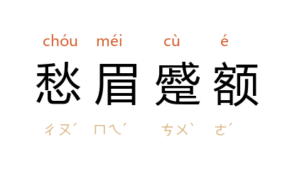 引茅盾 《血战后一周年》:“内地的小商人为了 上海 ‘钱庄不通’,而愁眉蹙额。”李六如 《六十年的变迁》第一卷第六章:“武昌 这方面的很多高级负责人员,就像患了神经衰弱症似的,愁眉蹙额,胆战心惊。”