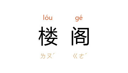 引《三国演义·第七八回》:「苏越画成九间大殿,前后廊庑楼阁,呈与操。」《儒林外史·第二二回》:「循著塘沿走,望见那边高高低低许多楼阁。」