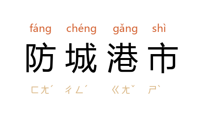 ⒈ 在广西壮族自治区西南部,南临北部湾,南防铁路通此。1993年由防城各族自治县改设市。人口538万(1995年)。为广西西南部新兴的重要港口城市、中国西南地区出海口之一。特产桂皮、砂仁、八角茴香、珍珠。