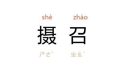引《说郛》卷七六引 宋 储泳 《祛疑说·移景法》:“如移景之法,类多彷彿。惟一法如烈日中影,人无不见,视诸家移景之法特异。及得其説,乃隐像於镜,设灯於旁,灯镜交辉,传影於纸。此术近多施之摄召,良可笑也。”《初刻拍案惊奇》卷十七:“小道有法术摄召,可以致得尊夫亡魂来与娘子相会一番。”清 纪昀 《阅微草堂笔记·槐西杂志四》:“因摄召花妖,俾先至君家中半年。”