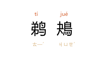 ⒈ 鸟名。即杜鹃。《楚辞·离骚》:“恐鹈鴂之先鸣兮,使夫百草为之不芳。”王逸注:“鹈鴂,一名买?,常以春分鸣也。”一说鹈鴂与杜鹃为两种鸟。洪兴祖补注:“按《禽经》云:嶲周,子规也。江介曰子规,蜀右曰杜宇。又曰:鶗鴂鸣而草衰。注云:鶗鴂,《尔雅》谓之鵙,《左传》谓之伯赵。然则子规、鶗鴂,二物也。”