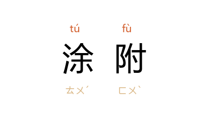 ⒈ 《诗·小雅·角弓》:“毋教猱升木,如涂涂附。”犹言拼凑;吸取。犹言牵强附会;随意篡改。中国近代史资料丛刊《辛亥革命·四川铁路案档案》:“﹝盛宣怀﹞于阁制发表之后二日首先破坏,单衔入奏,罔上欺民,涂附政策,酿成祸阶。”
