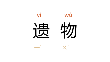 ⒈ 前人所遗留下来的东西、器物。可供考古学家研究,一为文化遗物,如器物、建筑等;一为自然遗物,如花粉、骨骸等。