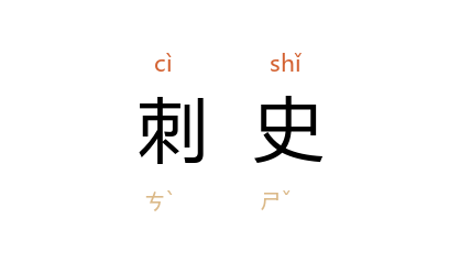 ⒈ 古代官名。原为朝廷所派督察地方之官,后沿为地方官职名称。 汉武帝 时,分全国为十三部(州),部置刺史。 成帝 改称州牧, 哀帝 时复称刺史。 魏 晋 于要州置都督兼领刺史,职权益重。 隋炀帝、唐玄宗 两度改州为郡,改称刺史为太守。后又改郡为州,称刺史,此后太守与刺史互名。 宋 于州置知州,而无刺史职任,刺史之名仅为武臣升迁之阶。 元 明 废名, 清 仅用为知州之别称。