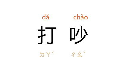 引《儒林外史》第十五回:“弟兄三个都是秀才,两个疑惑老子把家私偏了小儿子,在家打吵,吵的父亲急了,出首到官。”《孽海花》第二七回:“乾脆的説一句, 老佛爷 和万岁爷打吵子,大婚后纔起的。”冰心 《两个家庭》:“他们老妈子真可笑,各人护着各人的少爷,因此也常常打吵。”