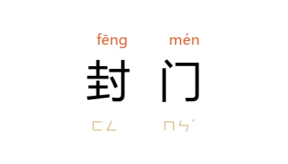 ⒉ 旧时在大门外侧,另外架置一道镂空的木制半截门,用以采光,称为「封门」。白天只关封门,到了夜间才栓起木板房门以保安全。