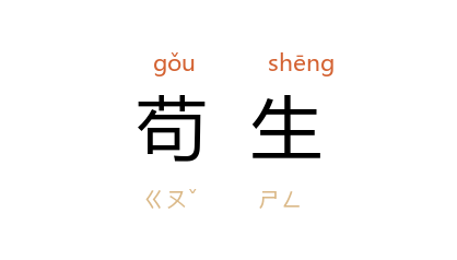 引《荀子·礼论》:“故人苟生之为见,若者必死。”唐 韩愈 《鄠人对》:“陷於危难能固其忠孝,而不苟生之逆乱,以是而死者,乃旌表门閭。”明 陈子龙 《王明君》诗:“天子方厌战,妇人聊苟生。”