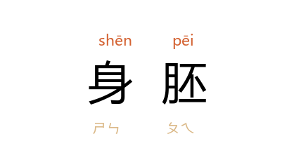 引叶紫 《山村一夜》:“衣服身胚一共有多少斤重量,都会看出来的。”沙汀 《烦恼》:“她身胚高大。”陆文夫 《二遇周泰》:“见师傅还是老样子,腰板挺直,身坯高大,腮帮上满是青青的胡碴子。”