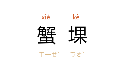 ⒉ 高地。汉刘向《说苑·复恩》:“臣笑臣邻之祠田也,以奁饭与一鲋鱼。其祝曰:'下田洿邪,得谷百车,蟹堁者宜禾。'臣笑其所以祠者少,而所求者多。”《荀子·儒效》“解果其冠”唐杨倞注:“蟹螺者宜禾,污邪者百车。蟹螺,盖高地也。”清李调元《卍斋琐录》卷二:“蟹螺者宜禾,蟹螺,高地也。《战国策》蟹螺作欧寠。”一说,犹平正。