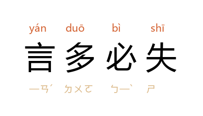 引语本《鬼谷子·本经符》:“言多必有数短之处。”清 朱用纯 《治家格言》:“处世戒多言,言多必失。”秦纪文 薛汕 《再生缘》弹词第十回:“荣兰 想小姐话说得好痛快,再要多说,言多必失,不要露出马脚来。”