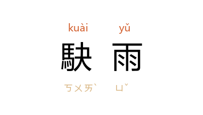 引《太平广记》卷九七引 唐 皇甫枚 《三水小牍·从谏》:“忽一日,穨云駃雨,霆击石傍大檀。”金 元好问 《乙酉六月十一日雨》诗:“今日復何日,駃雨东南来。”清 周亮工 《同兰江赵丙三往返北道归渡滹沱》诗:“庖风兼駃雨,不敢劝加餐。”