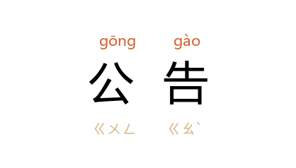 ⒈ 政府、团体对重大事件发布的通告。如《毛主席宣布中华人民共和国中央人民政府成立的公告》。