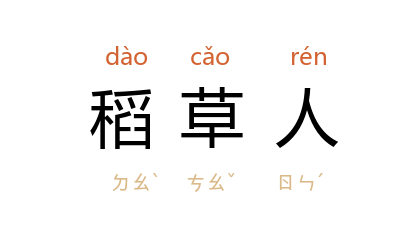⒈ 用稻草做成的假人,树立在田间,用来驱逐啄食农作物的鸟类。