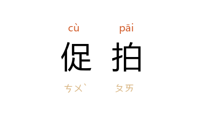 ⒈ 节奏急促的乐曲。宋张表臣《珊瑚钩诗话》卷二:“乐部中有促拍催酒,谓之《三台》。唐士云:'蔡邕自侍书御史,累迁尚书,不数日间,遍历三台。乐工以邕洞晓音律,故制曲以悦之。'”词曲中亦有冠以“促拍”之曲调名。如词中有《促拍采桑子》、《促拍满路花》;北曲《般涉调》中有《促拍令》,亦称《急曲子》。