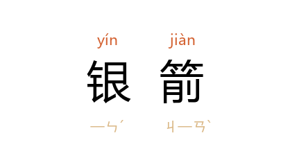 ⒉ 比喻白亮的箭形事物。(1)比喻月光。宋欧阳修《越溪春》词:“归来晚驻香车,银箭透窗纱。”(2)比喻雨柱。金元好问《张主簿草堂赋大雨》诗:“淅树蛙鸣告雨期,忽惊银箭四山飞。”