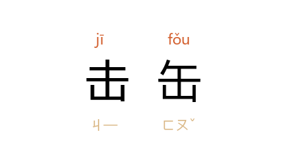 ⒈ 亦作“击缻”。敲击瓦缶。古人或以缶为乐器,用以打拍子。缶,瓦盆。