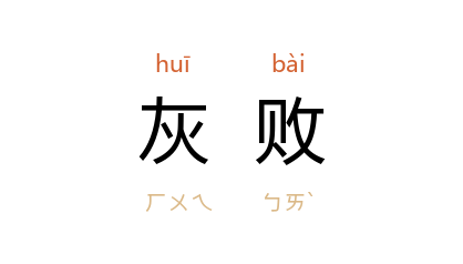 引茅盾 《虹》九:“李无忌 脸色灰败,惘然答应着。”叶圣陶 《疑》:“于是就有荒凉枯寂的坟墓,灰败无光的白骨,历历呈现在自己的幻想里。”