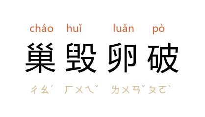 ⒈ 鸟巢被毁,巢里的鸟卵也会破毁。比喻家族被灭,家族的成员亦无一幸免。语本亦可比喻国家被毁,个人也无法幸存。也作「巢倾卵破」。