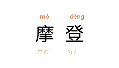 ⒈ 现代的、时髦的,指思想、穿著或言行迎合时尚。为英语modern的音译。