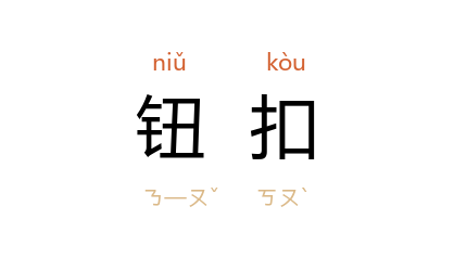 ⒈ 扣住衣服的钮子,式样繁多,大小亦应有尽有。元·王实甫也作「纽扣」、「纽子」、「纽扣」、「钮子」、「扣子」、「扣儿」。