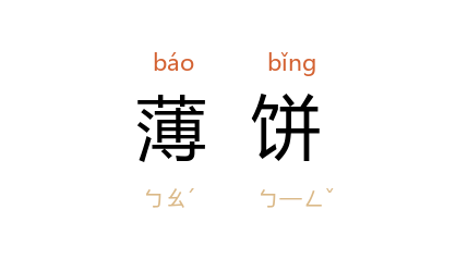 ⒈ 北方人的传统面食。以烫面制饼,很薄。两张相叠,烙熟后揭为两张,用来卷菜、肉肴。