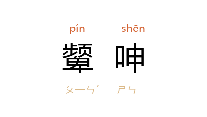 引宋 黄庭坚 《赠送张叔和》诗:“吏能束缚老姦手,要使鰥寡无顰呻。”任渊 注:“顰呻,谓蹙頞悲叹。”宋 范成大 《乐先生辟新堂以待芍药酴醿作诗奉赠》:“百年顰呻顷,共此过隙光。”清 黄宗羲 《念桩许公霍丘名宦录序》:“但使里巷阡陌之间,其顰呻得自达而已。”