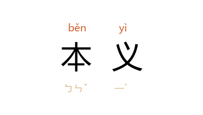 ⒉ 造字之初赋予文字的原本意义。如「日」的本义是太阳;后渐有引申、假借等义滋生。