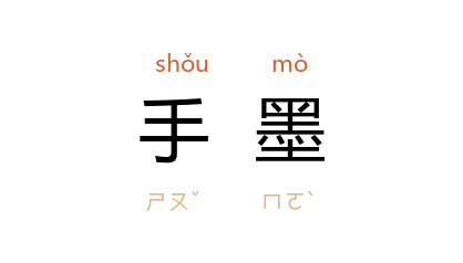 引《宋书·范晔传》:“於是悉出檄书、选事及同恶人名、手墨翰跡,谨封上呈,凶悖之甚,古今罕比。”《新唐书·李彦芳传》:“家故藏 高祖、太宗 赐 靖 詔书数函……皆 太宗 手墨。”清 王端履 《重论文斋笔录》卷一:“日华 手墨,余曾见之,体杂行草。”