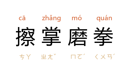 亦作“擦拳磨掌”。 《儿女英雄传》第二五回:“一箇箇擦拳磨掌,吊胆提心的。”