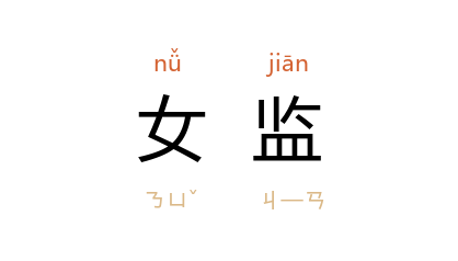 引《福惠全书·卷一三·刑名部·监禁》:「于外监之侧,另置一所,高其墙垣,榜曰:『女监』,毋与男监相比。」《醒世恒言·卷一六·陆五汉硬留合色鞋》:「张荩押付女囚牢里,潘寿自入女监收管。」