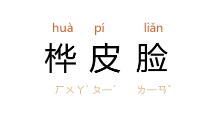 引元 无名氏 《独角牛》第三折:“这廝人也憎,鬼也嫌,无处发付那千层樺皮脸。”明 贾仲名 《对玉梳》第二折:“村势煞捻着则管独磨,樺皮脸风痴着有甚颩抹。”