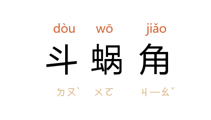 ⒈ 《庄子·则阳》:“有国于蜗之左角者曰触氏,有国于蜗之右角者曰蛮氏,时相与争地而战,伏尸数万,逐北旬有五日而后反。”后以“斗蜗角”比喻因细小之事而引起争斗。