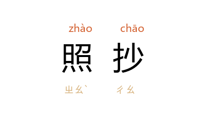 ⒈ 亦作“照钞”。照样抄录;完全沿袭。