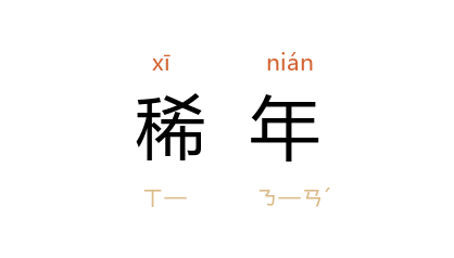 引唐 杜甫 《曲江》诗之二:“酒债寻常行处有,人生七十古来稀。”后因以“稀年”为七十岁的代称。 宋 李昴 《水调歌头·寿参政徐意一》词:“地位到公辅,耆艾过稀年。”