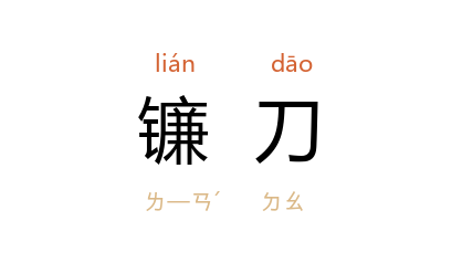 ⒈ 亦作“鎌刀”。收割谷物和割草的农具。由弧形的刀片和木柄构成。有的刀片上带小锯齿。