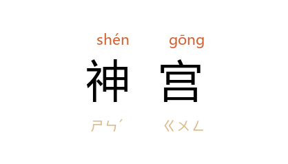 引三国 魏 阮籍 《大人先生传》:“先生过神宫而息,潄 吾泉 而行,迴乎逌而游览焉。”南朝 梁 沉约 《梁宗庙登歌》之七:“神宫肃肃,灵寝微微。”