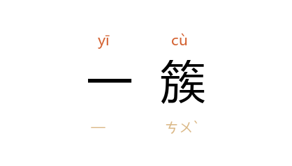 引唐 杜甫 《江畔独步寻花》诗之五:“桃花一簇开无主,可爱深红爱浅红?”金 元好问 《塞上曲》:“平沙细草散牛羊,一簇征人在戍楼。”《儿女英雄传》第十四回:“安老爷 一望,只见前面有几丛杂树,一簇草房。”沙汀 《航线》:“在一簇屋子的高处,一片惹眼的红色奔过去了。”马烽 西戎 《吕梁英雄传》第九回:“只见红红绿绿一簇人马下来,霎时已进了村。”