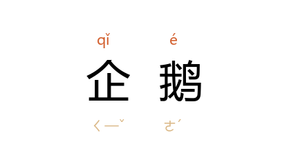 ⒈ 动物名。鸟纲企鹅目游禽类。嘴尖而硬,颈稍长,足短,附于近尾处,前三趾张蹼,尾短翼小,覆有鳞片状的羽毛,善潜水,上陆时,足与尾并用,直立其体如有所企望,故称为「企鹅」。
