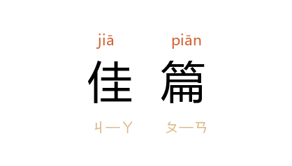 引南朝 梁 刘勰 《文心雕龙·乐府》:“子建、士衡,咸有佳篇。”唐 李白 《答族侄僧中孚赠玉泉仙人掌茶》诗:“宗英乃禪伯,投赠有佳篇。”明 叶显祖 《鸾鎞记·品诗》:“佳篇见投,他怎敢糊涂了应酬。”清 李渔 《风筝误·惊丑》:“这等小姐的佳篇,请念一念。”