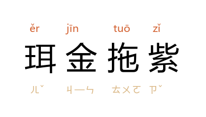 ⒈ 珥金,汉侍中、常侍的冠都插貂尾、金铛作装饰。拖紫,南北朝以后,贵官的公服有朱紫、金紫之称。珥金拖紫指显赫的官位。