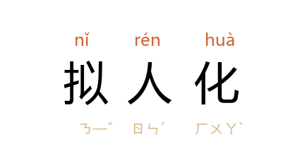 ⒈  将动物、抽象观念或其他无生命的事物,赋予人类的形体、性格、情感等,表现人的举动或思想情感的一种表现方式。