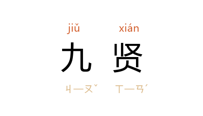 ⒉ 九个贤人。指 尧、舜、禹、文王、皋陶、启、契、史皇、羿 等九人。见《淮南子·修务训》。