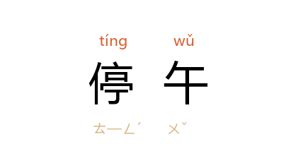 引北魏 郦道元 《水经注·江水二》:“﹝ 三峡 ﹞重巖叠嶂,隐天蔽日,自非停午夜分,不见曦月。”宋 梅尧臣 《庖烟》诗:“湿薪烧尽日停午,试问霏霏何处浮。”清 阮葵生 《茶馀客话》卷九:“尝试 保和殿,未停午,众方执笔著想,闻有投卷者。”